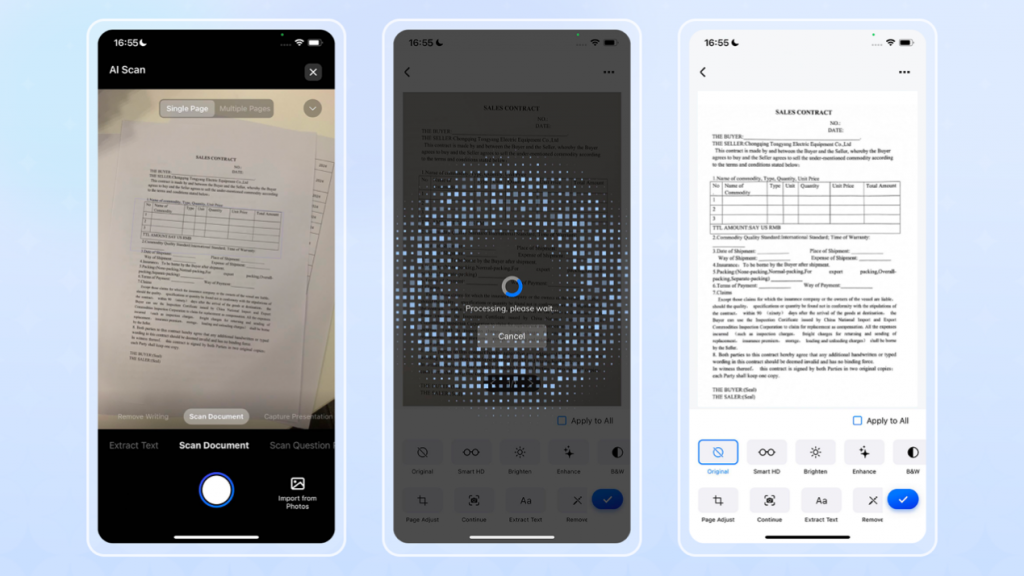 Escaneo múltiple en ráfaga: Ya sean libros de texto voluminosos, contratos de varias páginas o apuntes sueltos, puedes digitalizar todo de una sola vez con el modo ráfaga de Escaneo con IA.